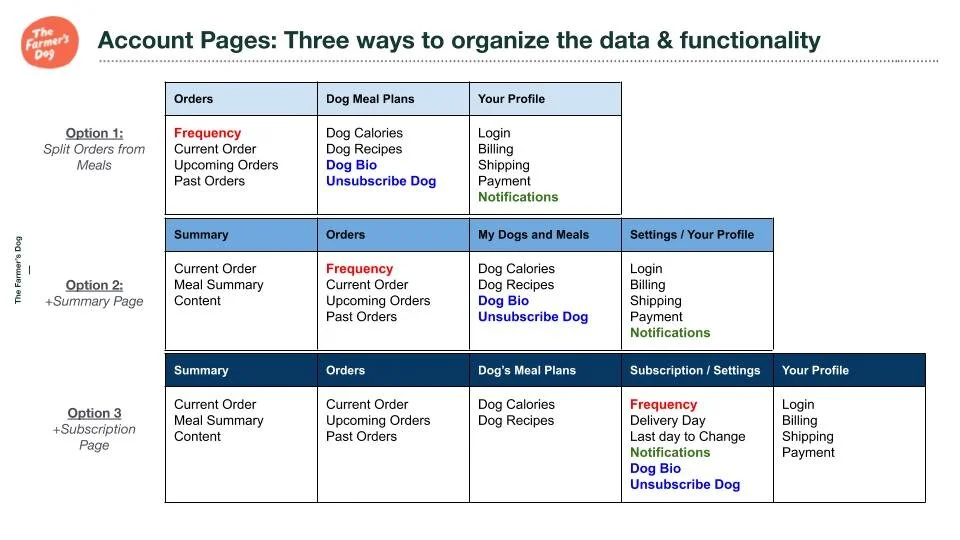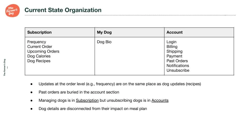 Once subscribed, subscription holders manage their account, order, and dog’s meal plan through this portal. Originally, the portal was intended to perform all core functions in one place. My role at The Farmer’s Dog was to reorganize the information architecture and streamline the user experience for the subscriber/account management portal.