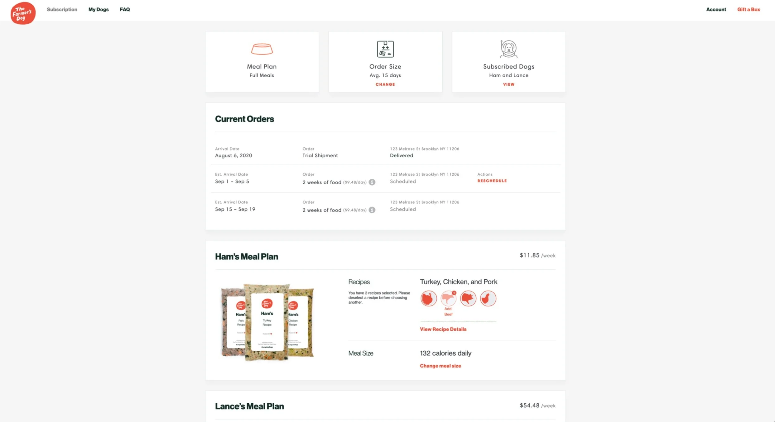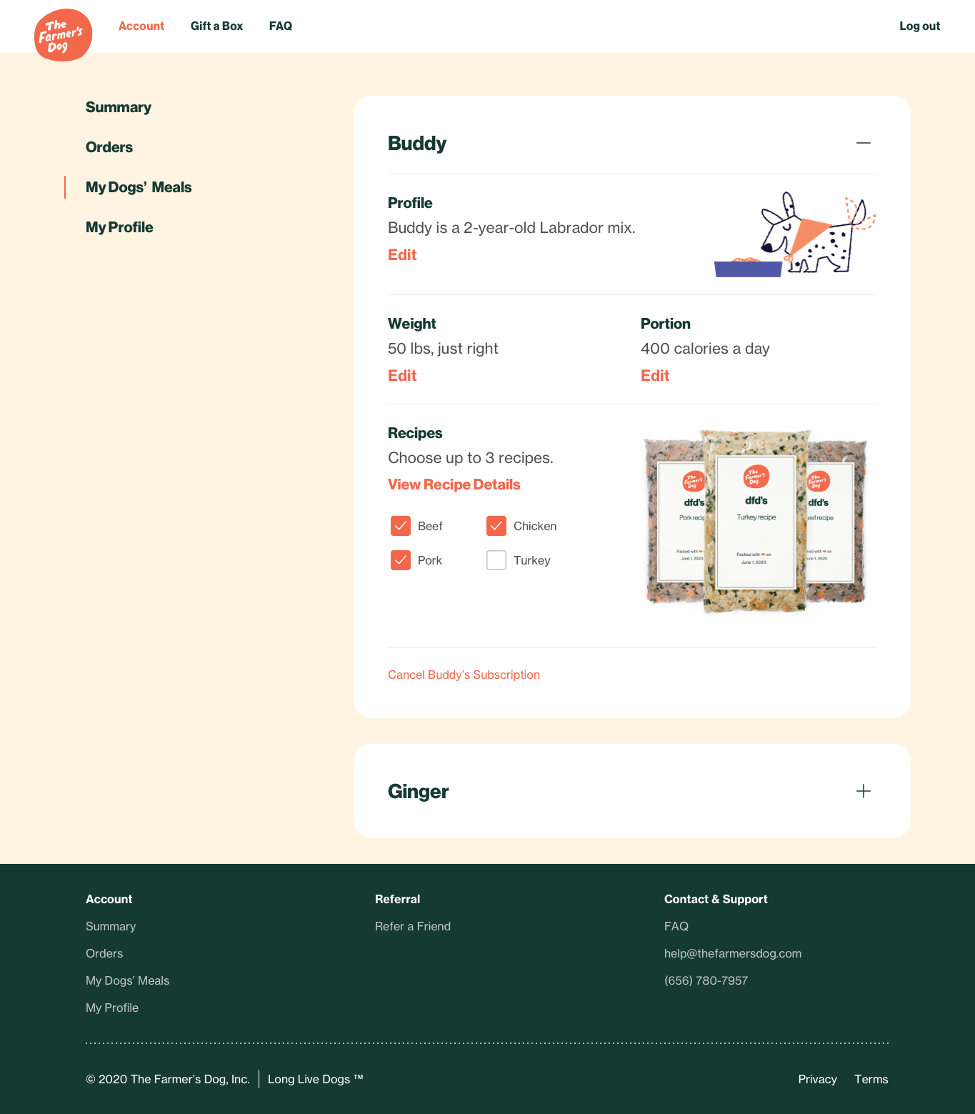 This is where the subscriber would make adjustments to their dog’s meals including: choosing recipes, adjusting portions, update your dog’s general profile information, and cancel your dogs subscription.